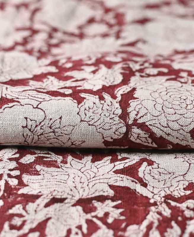 Hand-carved nature-inspired motifs unfold across this fabric in a rhythmic, repeating design. Each layer is block printed by hand using centuries-old techniques passed down through generations of artisans in India. The result is a textile rich in character—bringing softness, dimension, and a distinctly human touch to any space. Designed to layer with ease, it complements both relaxed and refined interiors.