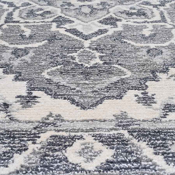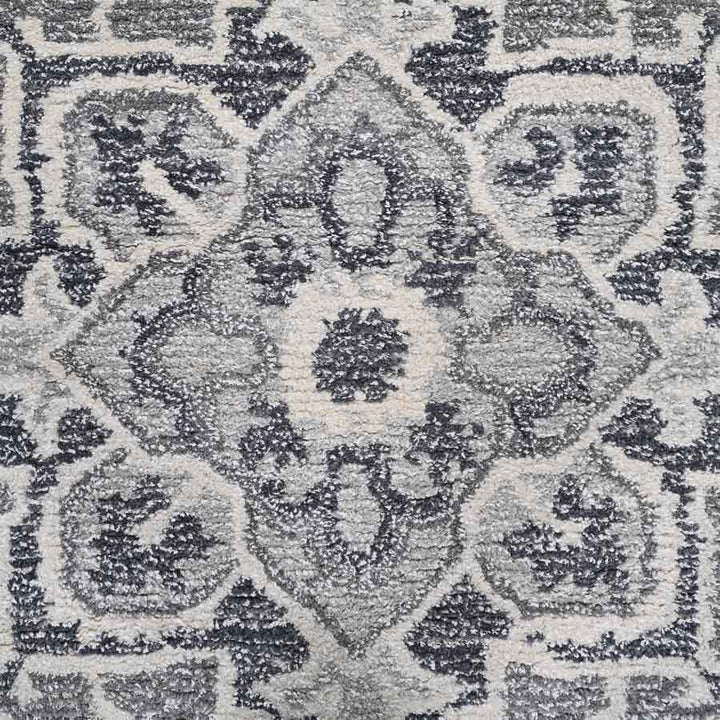 Rooted in timeless artistry, this hand-tufted rug is crafted from a premium blend of wool and viscose, offering both durability and refined beauty. The strength and warmth of wool meet the silky sheen of viscose, creating a plush surface that feels luxurious underfoot. Inspired by classic Oushak motifs, its decorative floral pattern brings depth and tradition into a modern setting. With a palette of deep steel grey, black, and soft accents of white dove and sage, this hand-tufted wool area rug anchors interiors with sophistication and character. Perfect for those who appreciate heritage design reinterpreted with contemporary materials.