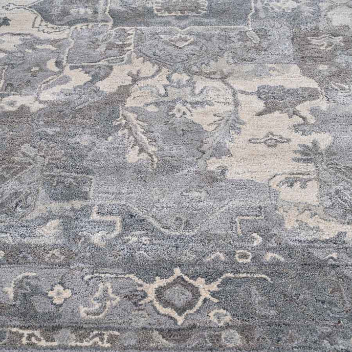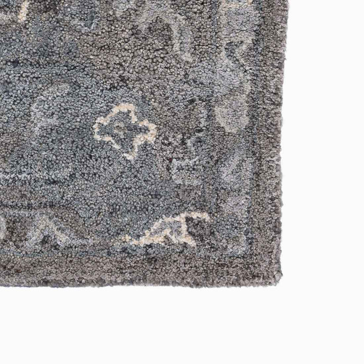 Rooted in timeless artistry, this hand-tufted rug is crafted from a premium blend of wool and viscose, offering both durability and refined beauty. The strength and warmth of wool meet the silky sheen of viscose, creating a plush surface that feels luxurious underfoot. Inspired by classic Oushak motifs, its decorative floral pattern brings depth and tradition into a modern setting. With a palette of deep steel grey, black, and soft accents of white dove and sage, this hand-tufted wool area rug anchors interiors with sophistication and character. Perfect for those who appreciate heritage design reinterpreted with contemporary materials.