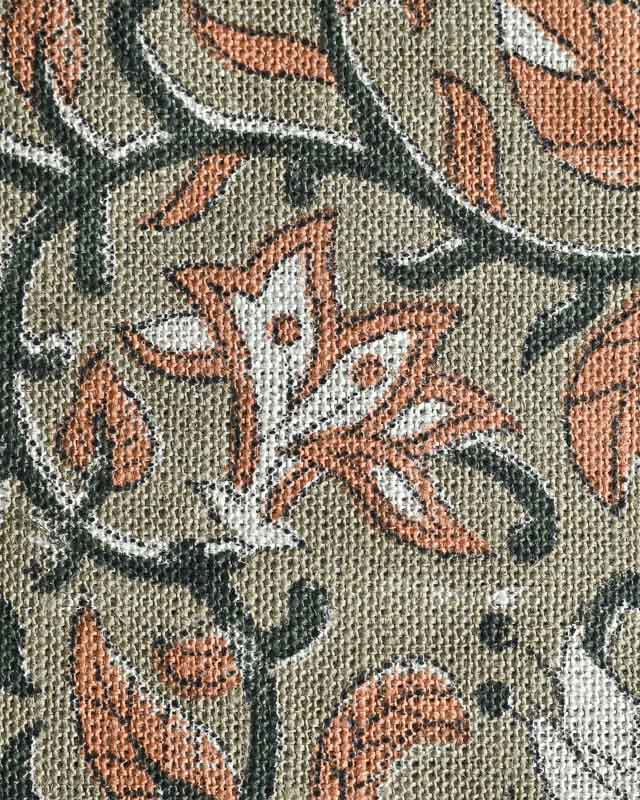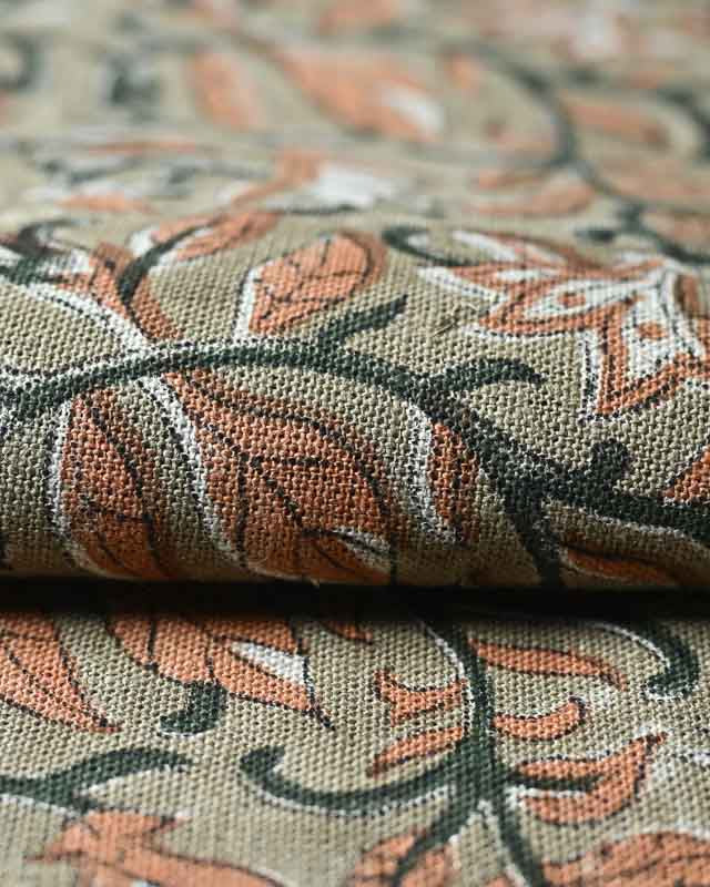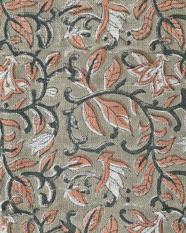 Hand-carved nature-inspired motifs unfold across this fabric in a rhythmic, repeating design. Each layer is block printed by hand using centuries-old techniques passed down through generations of artisans in India. The result is a textile rich in character—bringing softness, dimension, and a distinctly human touch to any space. Designed to layer with ease, it complements both relaxed and refined interiors.