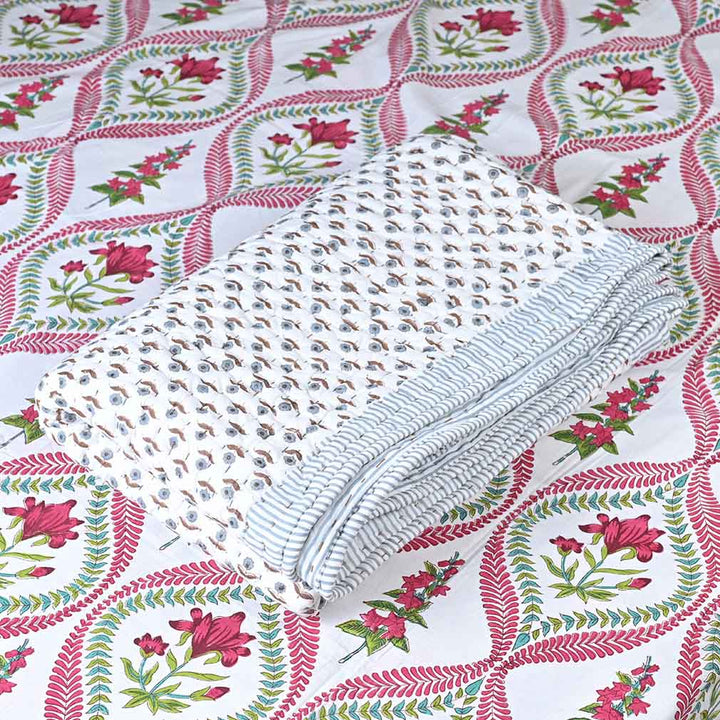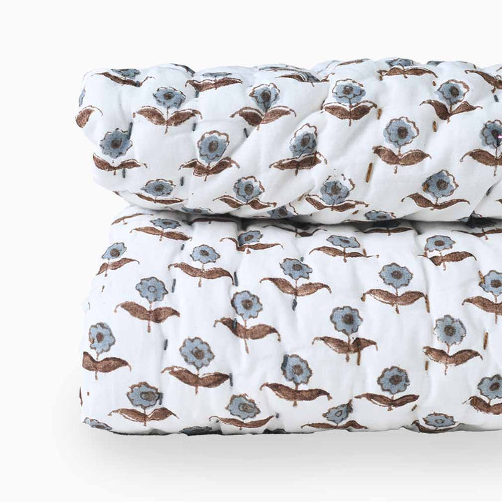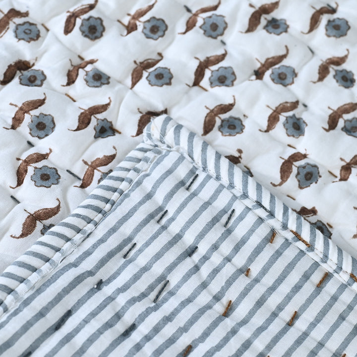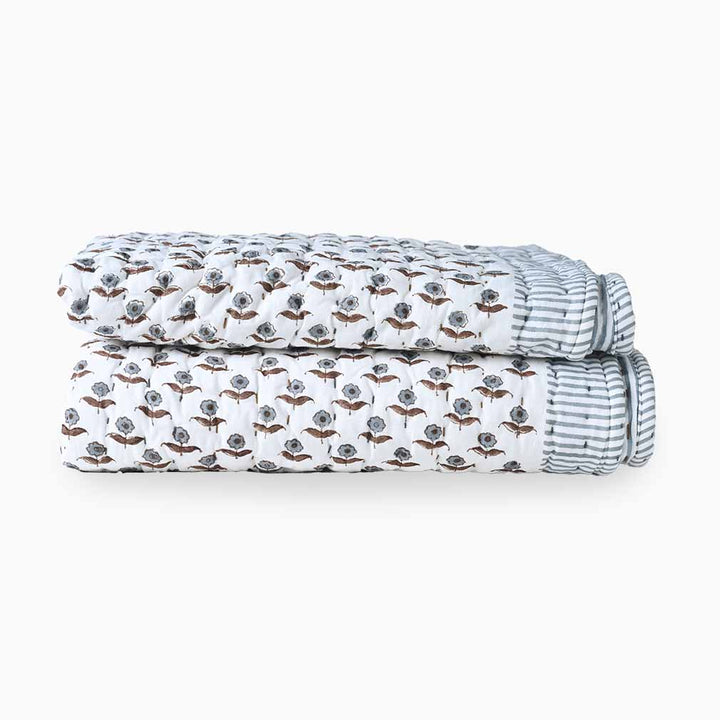 The Freesia Hand Block Printed Quilt is crafted from soft, breathable cotton and filled with pure cotton batting for all-season comfort. This reversible cotton handstitched quilt features delicate floral buti motifs on one side, while the reverse offers timeless stripes—two designs in one to effortlessly refresh your bedroom décor. Each quilt is handmade and hand block printed by artisans in India, where wooden blocks are carved and pressed onto cotton fabric, creating subtle variations that make every piece unique. Light, cozy, and beautifully finished with fine hand quilting, it works equally well as a bedspread, comforter, or throw, and makes a thoughtful housewarming or wedding gift that blends artisanal heritage with modern living.