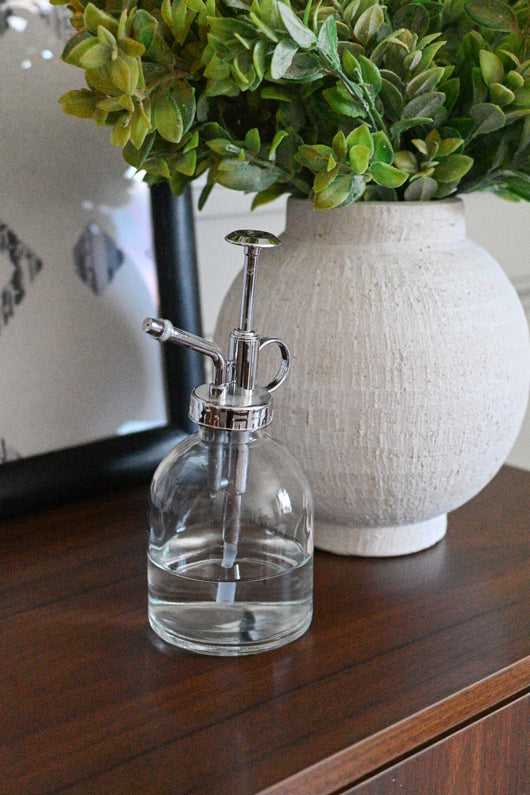 Vintage Charm: The vintage-inspired design features a clear glass body with a polished chrome pump and nozzle, combining functionality with aesthetic appeal. Its compact plants size and decorative look make it a beautiful addition to any windowsill, plant shelf, or gardening space.