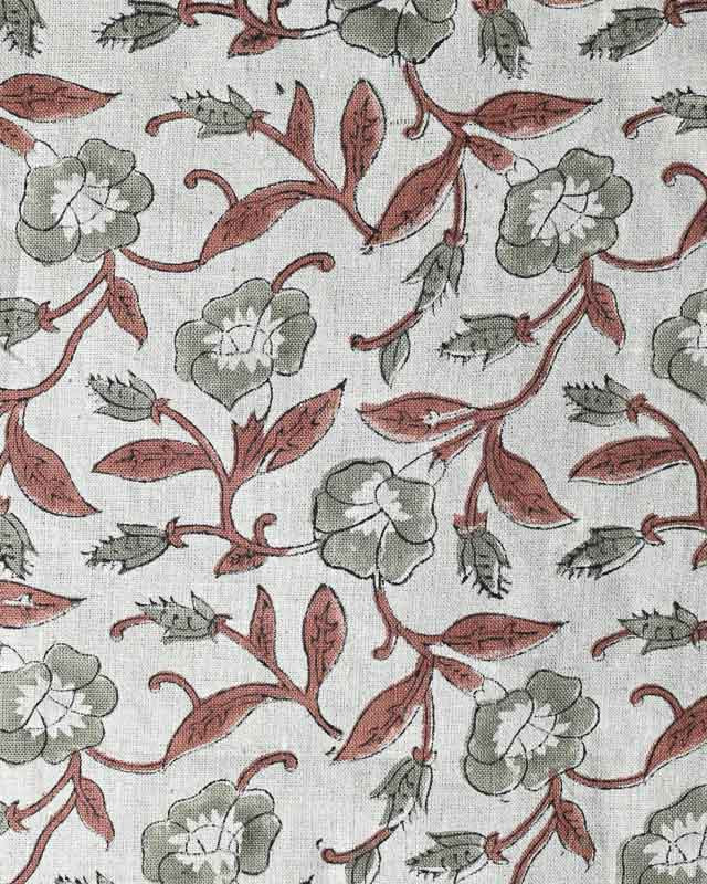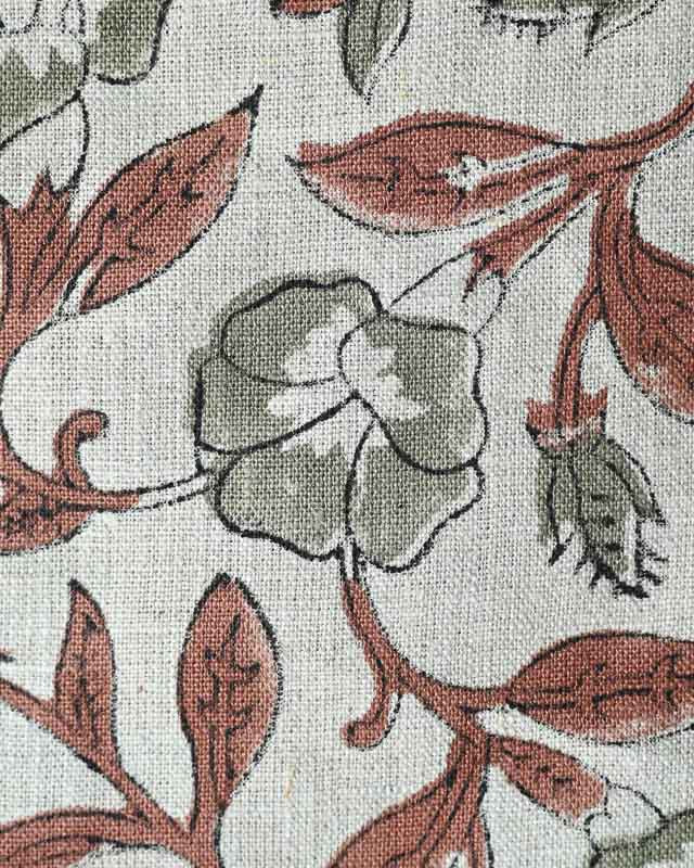 Hand-carved nature-inspired motifs unfold across this fabric in a rhythmic, repeating design. Each layer is block printed by hand using centuries-old techniques passed down through generations of artisans in India. The result is a textile rich in character—bringing softness, dimension, and a distinctly human touch to any space. Designed to layer with ease, it complements both relaxed and refined interiors.