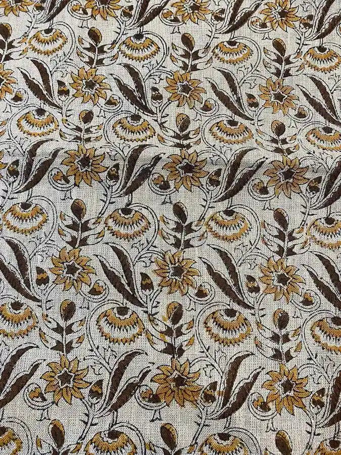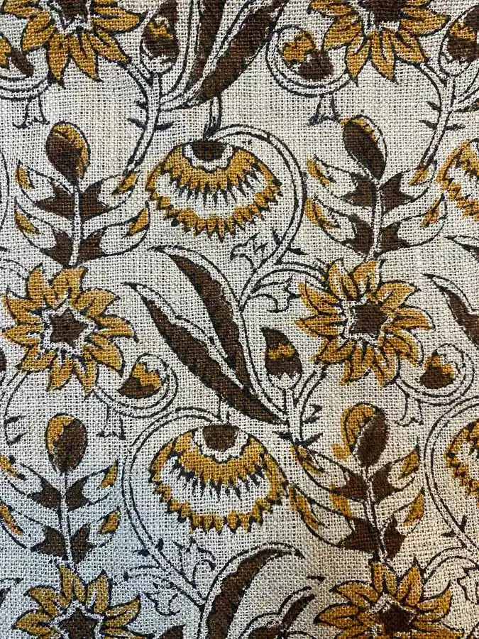 Hand-carved nature-inspired motifs unfold across this fabric in a rhythmic, repeating design. Each layer is block printed by hand using centuries-old techniques passed down through generations of artisans in India. The result is a textile rich in character—bringing softness, dimension, and a distinctly human touch to any space. Designed to layer with ease, it complements both relaxed and refined interiors.