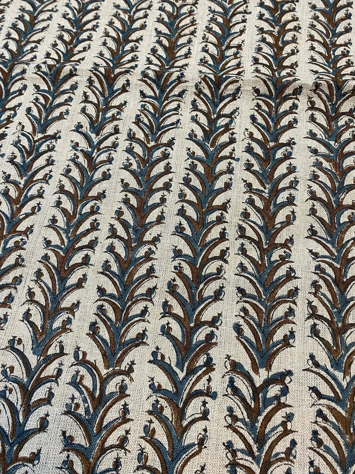 Hand-carved nature-inspired motifs unfold across this fabric in a rhythmic, repeating design. Each layer is block printed by hand using centuries-old techniques passed down through generations of artisans in India. The result is a textile rich in character—bringing softness, dimension, and a distinctly human touch to any space. Designed to layer with ease, it complements both relaxed and refined interiors.