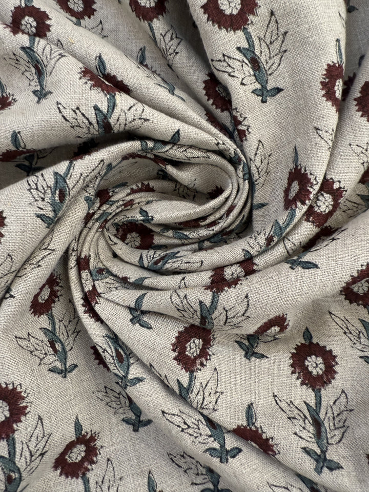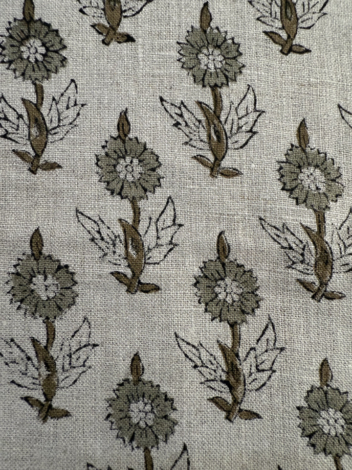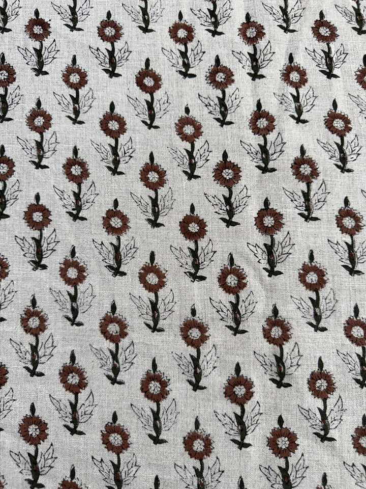 Hand-carved nature-inspired motifs unfold across this fabric in a rhythmic, repeating design. Each layer is block printed by hand using centuries-old techniques passed down through generations of artisans in India. The result is a textile rich in character—bringing softness, dimension, and a distinctly human touch to any space. Designed to layer with ease, it complements both relaxed and refined interiors.