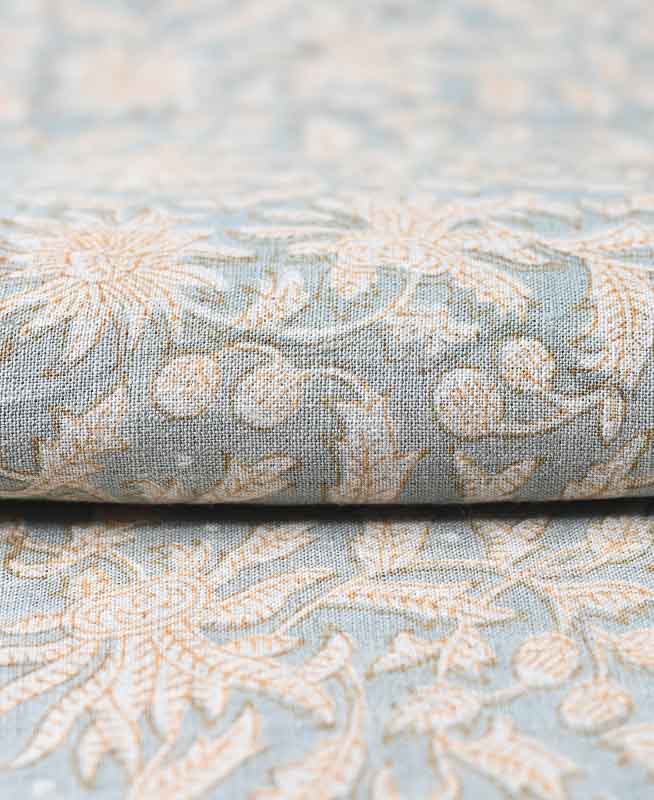 Hand-carved nature-inspired motifs unfold across this fabric in a rhythmic, repeating design. Each layer is block printed by hand using centuries-old techniques passed down through generations of artisans in India. The result is a textile rich in character—bringing softness, dimension, and a distinctly human touch to any space. Designed to layer with ease, it complements both relaxed and refined interiors.