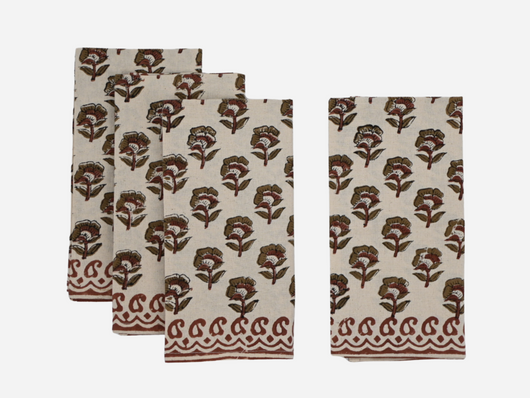 Elevate everyday dining with our hand-block printed napkins—crafted using traditional techniques passed down through generations. Each pattern is carved into wooden blocks and printed by hand, layer by layer, by skilled artisans in India. The result is a napkin rich in charm, character, and subtle variation—designed to bring a sense of artistry and warmth to both casual meals and special occasions.