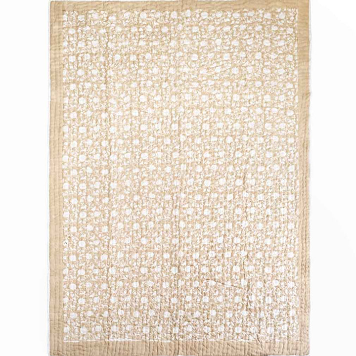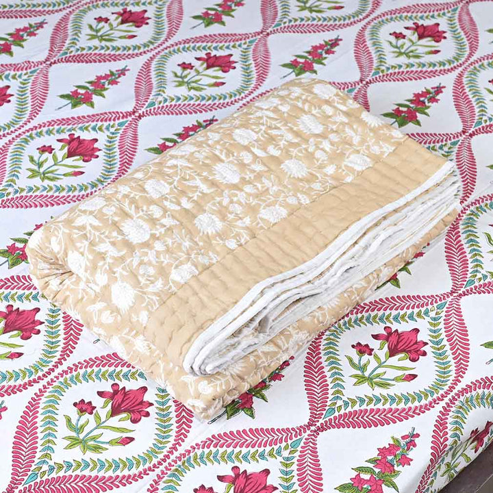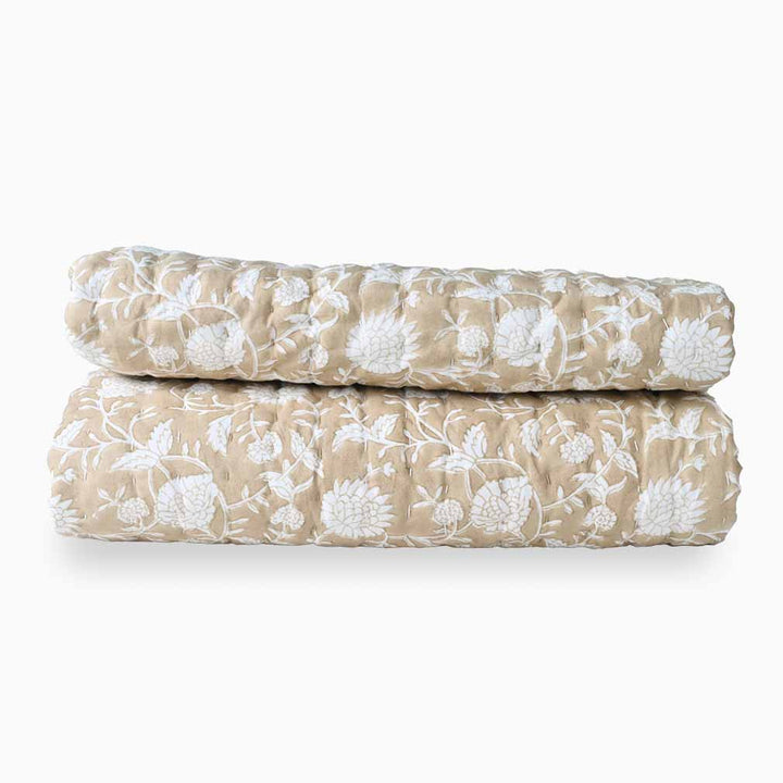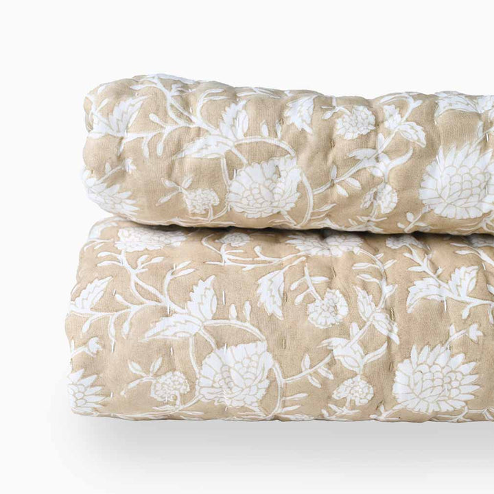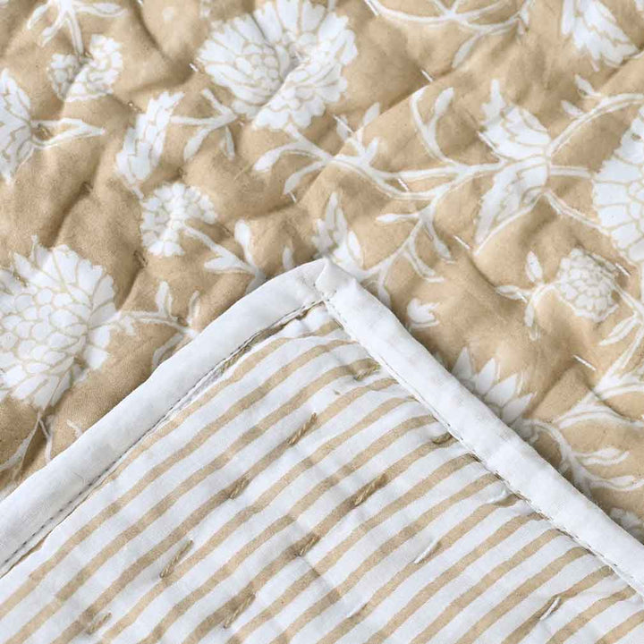 The Petunia Hand Block Printed Quilt is crafted from soft, breathable cotton and filled with pure cotton batting for all-season comfort. This reversible hand-stitched quilt features delicate floral leaves and vines motifs on one side, while the reverse showcases classic stripes—two distinct designs in one to effortlessly refresh your bedroom décor. Each quilt is handmade and hand block printed by skilled artisans in India, where carved wooden blocks are pressed onto cotton fabric, creating subtle variations that make every piece unique. Light, cozy, and beautifully finished with fine hand quilting, it works equally well as a bedspread, comforter, or throw, and makes a thoughtful gift for housewarmings, weddings, or special occasions that celebrates artisanal heritage.