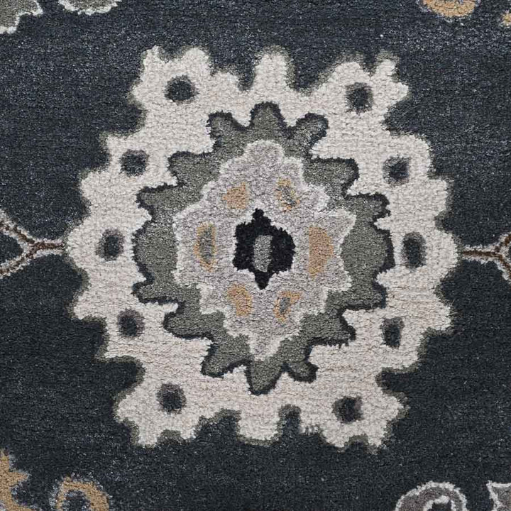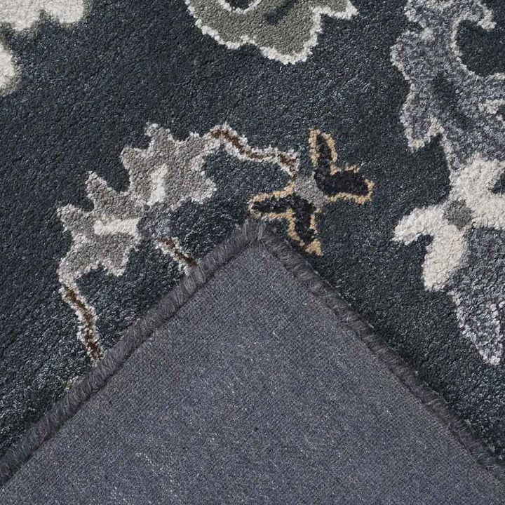 Rooted in timeless artistry, this hand-tufted rug is crafted from a premium blend of wool and viscose, offering both durability and refined beauty. The strength and warmth of wool meet the silky sheen of viscose, creating a plush surface that feels luxurious underfoot. Inspired by classic Oushak motifs, its decorative floral pattern brings depth and tradition into a modern setting. With a palette of deep steel grey, black, and soft accents of white dove and sage, this hand-tufted wool area rug anchors interiors with sophistication and character. Perfect for those who appreciate heritage design reinterpreted with contemporary materials.