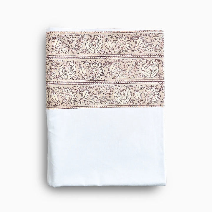 Elevate everyday dining with our hand-block printed tablecloths—crafted using traditional techniques passed down through generations. Each design is carved into wooden blocks and printed by hand, layer by layer, by skilled artisans in India. The result is a tablecloth rich in character and subtle variation—designed to bring artistry, warmth, and a collected feel to any gathering, casual or formal. A continuous floral border winds around all four sides of the block-printed tablecloth, bringing richness and layered charm to any table setting.