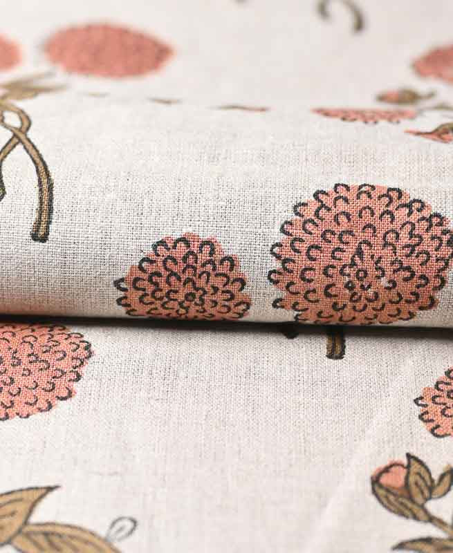 Hand-carved nature-inspired motifs unfold across this fabric in a rhythmic, repeating design. Each layer is block printed by hand using centuries-old techniques passed down through generations of artisans in India. The result is a textile rich in character—bringing softness, dimension, and a distinctly human touch to any space. Designed to layer with ease, it complements both relaxed and refined interiors.