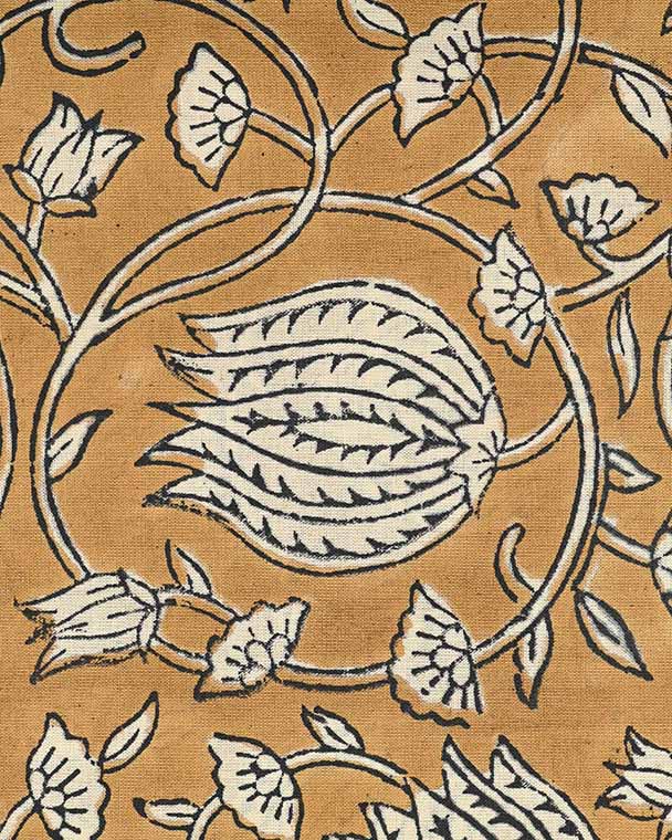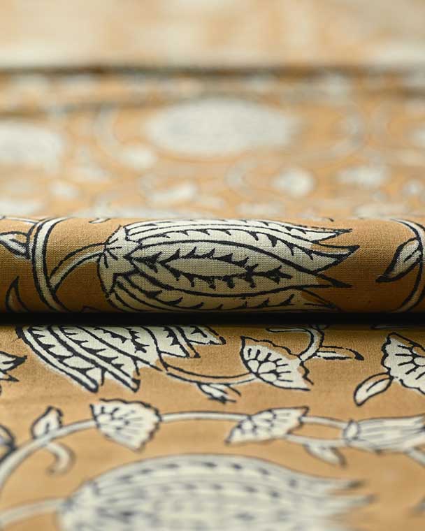 Hand-carved nature-inspired motifs unfold across this fabric in a rhythmic, repeating design. Each layer is block printed by hand using centuries-old techniques passed down through generations of artisans in India. The result is a textile rich in character—bringing softness, dimension, and a distinctly human touch to any space. Designed to layer with ease, it complements both relaxed and refined interiors.