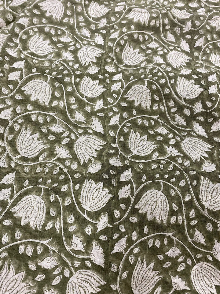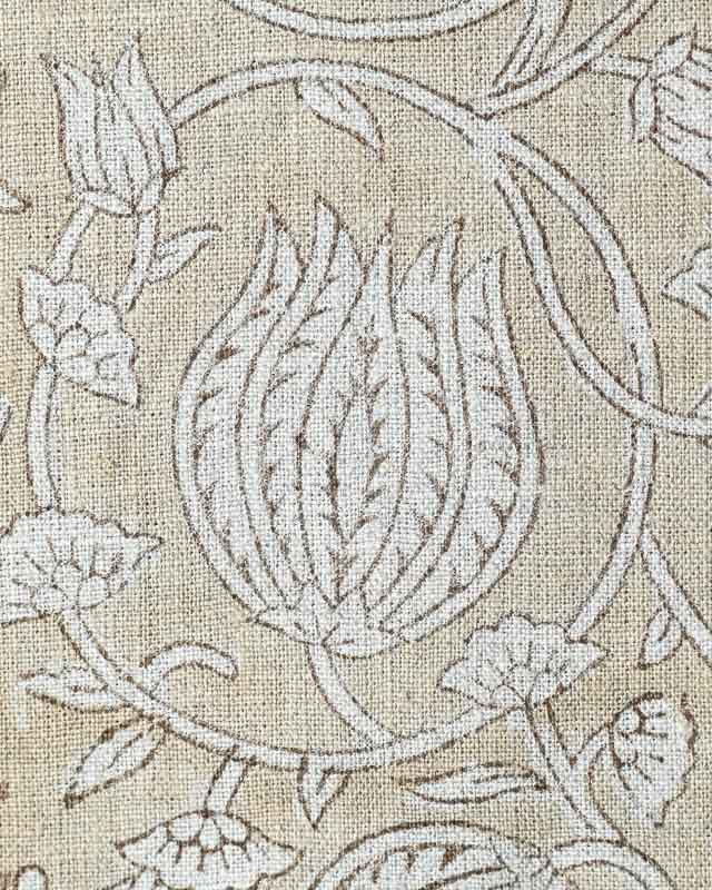 Hand-carved nature-inspired motifs unfold across this fabric in a rhythmic, repeating design. Each layer is block printed by hand using centuries-old techniques passed down through generations of artisans in India. The result is a textile rich in character—bringing softness, dimension, and a distinctly human touch to any space. Designed to layer with ease, it complements both relaxed and refined interiors.